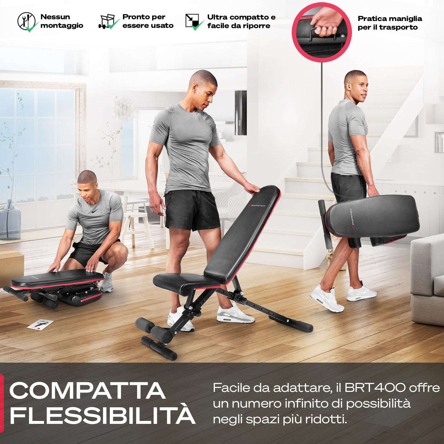 La panca palestra BRT400 è estremamente flessibile e ha un sistema di piegatura salvaspazio. Per noi di SPORTSTECH è importante che tutti abbiano la possibilità di tenersi in forma a casa propria. Per questo motivo, la nostra innovativa BRT400 panca palestra può essere ripiegata alle dimensioni ridotte di 85 x 37 x 24 cm in pochi semplici passi e quindi essere riposta in modo compatto sotto o accanto ai vostri mobili. Libera la strada per un allenamento flessibile nella tua palestra di casa!