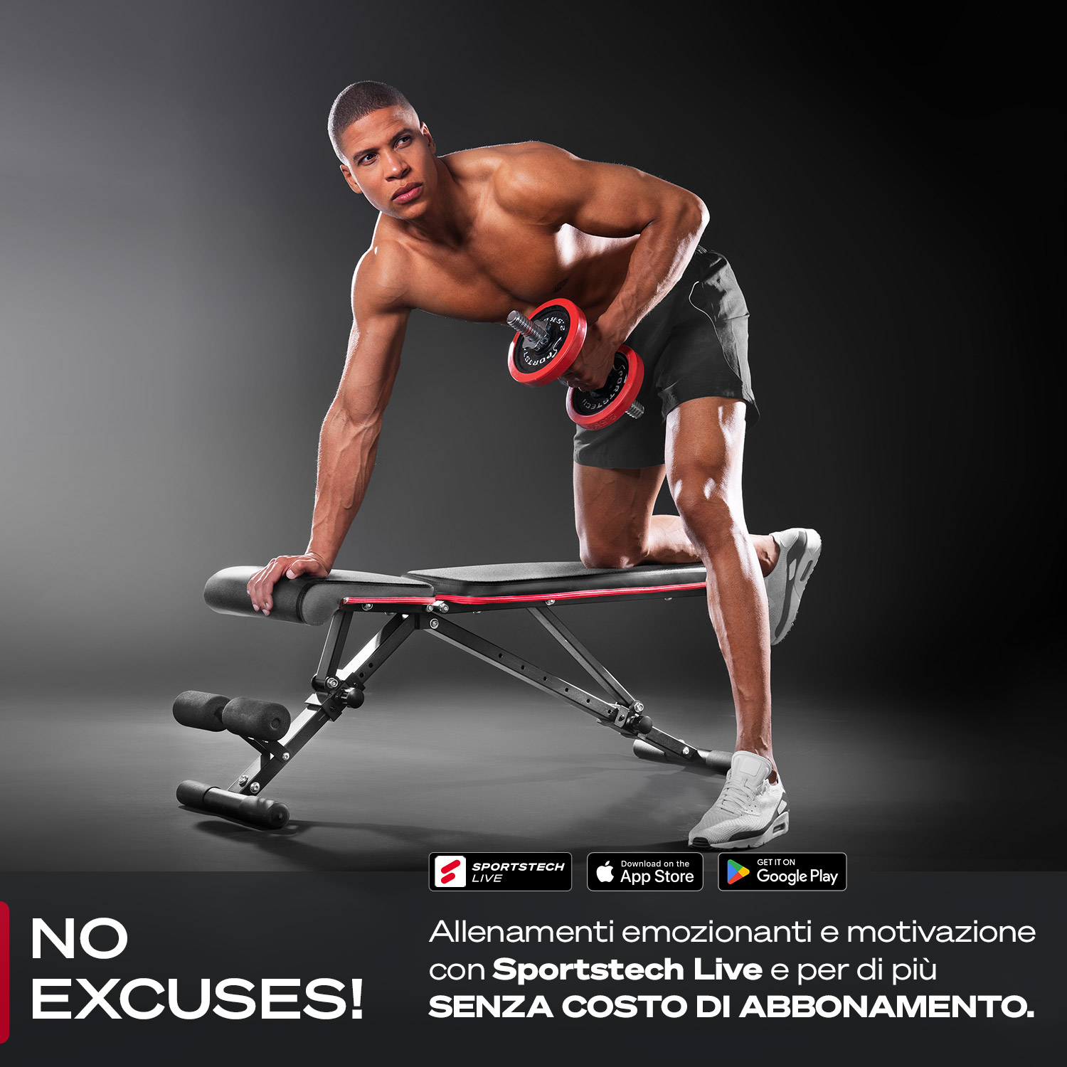 SPORTSTECH panca palestra BRT400 ti regala un allenamento efficace per tutto il corpo! Volete sapere cosa è possibile? Qualunque sia la parte muscolare a cui vuoi mirare, con SPORTSTECH BRT400 riuscirai a fare un allenamento vario per spalle, petto, addominali, schiena o gambe. Sia con manubri e bilancieri che da solo con il tuo peso corporeo: l'intelligente panca palestra BRT400 è ideale per un'esperienza di fitness individuale sulla strada verso un corpo allenato con muscoli d'acciaio.