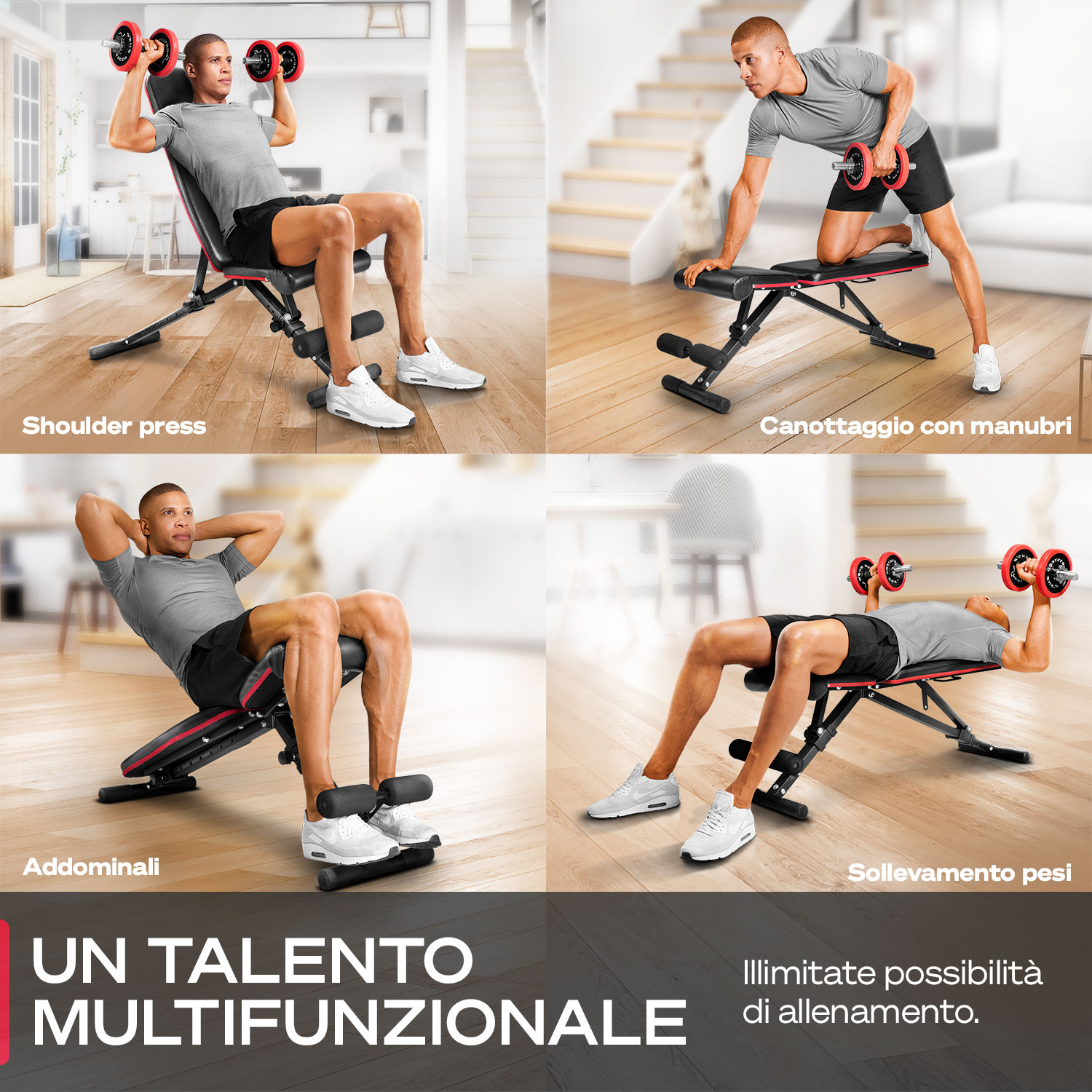 Variare esercizio variateè fondamentale nell'allenamento con i pesi, perché se si stimola il muscolo sempre nello stesso modo l'allenamento non è efficace. Ecco perché abbiamo sviluppato BRT400 panca palestra: per regalarvi un'incredibile varietà! Con più di 40 combinazioni di impostazioni diverse, puoi trasformare la panca palestra BRT400 in una panca piana o inclinata in pochissimo tempo e allenarti in posizione eretta, piana o all'ingiù secondo le tue preferenze. Allenamento di forza 2.0!