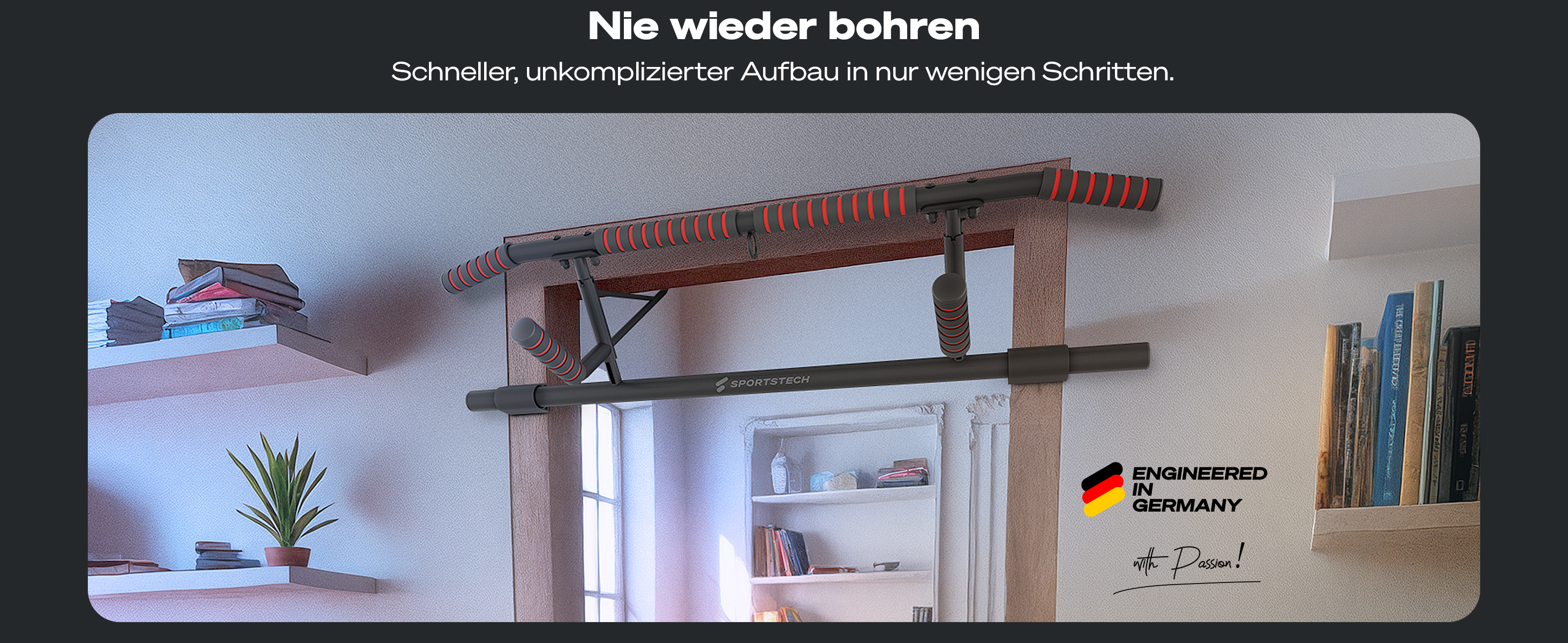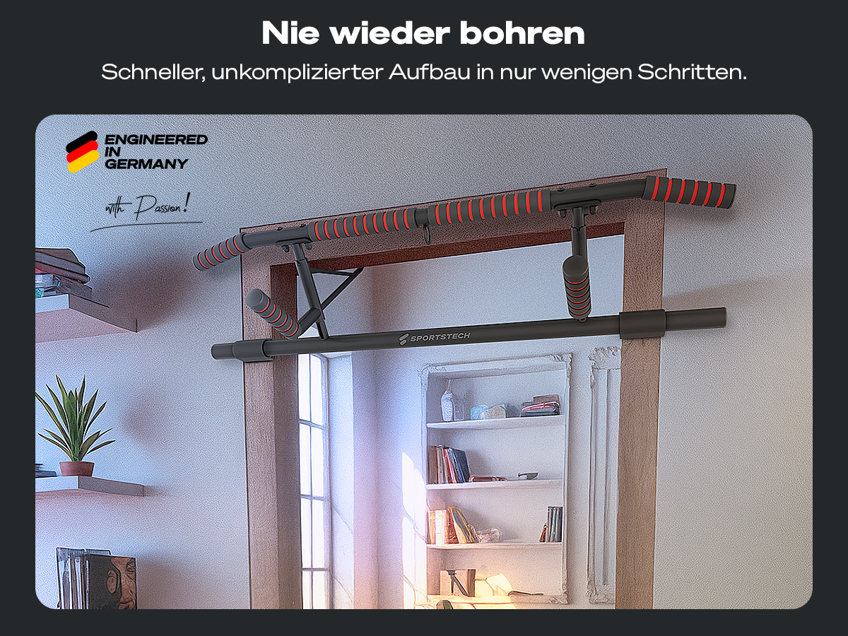 Nein, die Klimmzugstange wird ganz ohne Bohren oder Schrauben montiert. Sie wird einfach im Türrahmen eingehängt und ist schnell, unkompliziert und rückstandsfrei entfernbar.