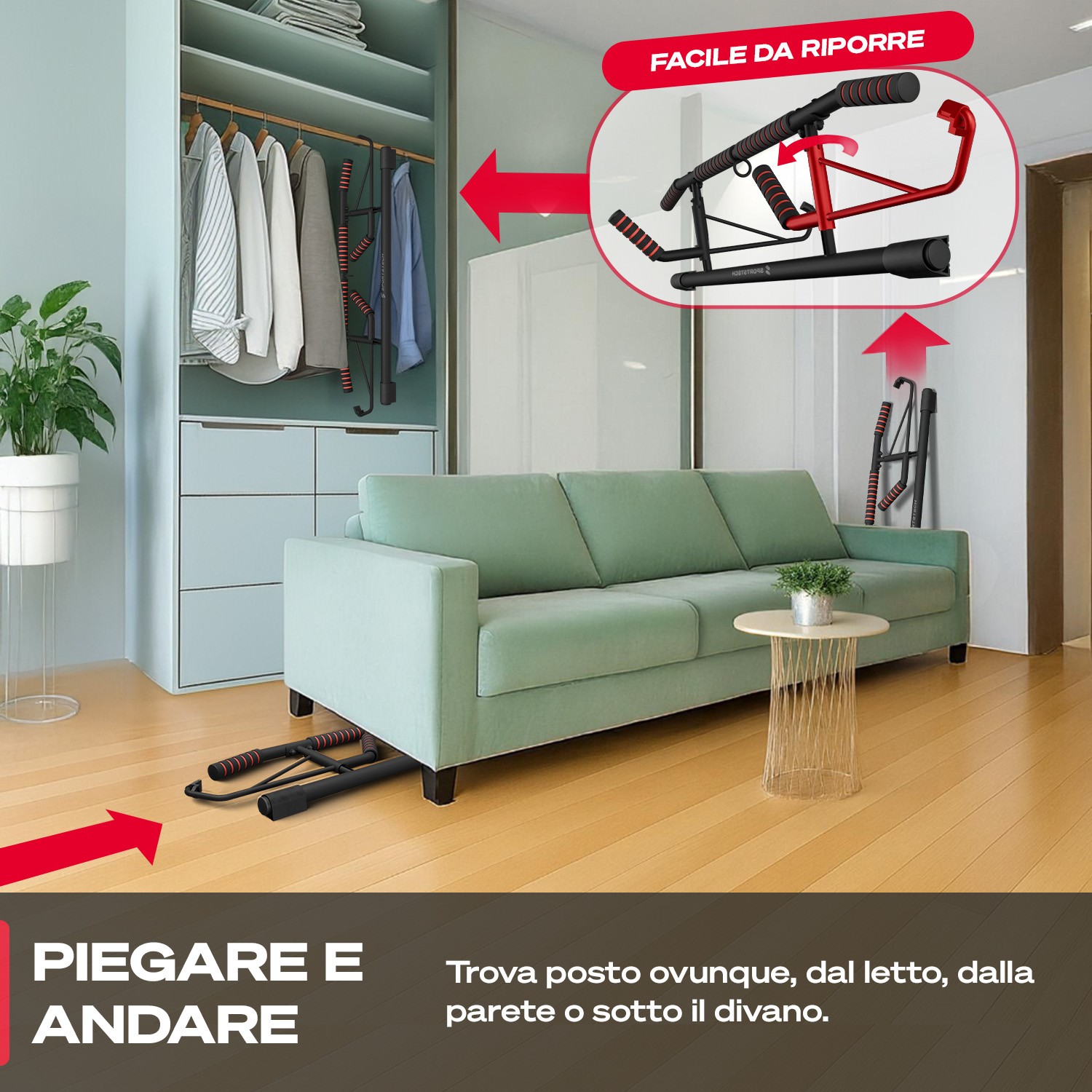 Die Klimmzugstange wiegt nur 3,8 kg und kann nach dem Training einfach abgenommen, eingeklappt und platzsparend verstaut werden.